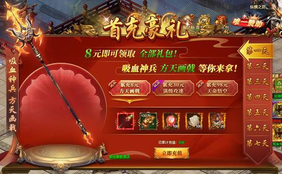 吸血神兵-方天画戟、满级攻速特权、如意金箍天命悟空时装、绝版称号等你来拿;连领七天,助你破敌无双,越变越强。