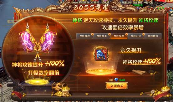 神将群攻、神将群羊、神将攻速、神将石化、神将伤害礼包,全方位提升打怪效率,助你成为BOSS克星。