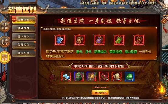 超值团购,可一步到位,激活周卡、月卡、活跃战令、等级投资、战力投资等超值奖励。