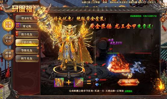 绝版黄金套装:黄金巨锤、龙王金甲套装免费送,完成纵横任务即可领取。