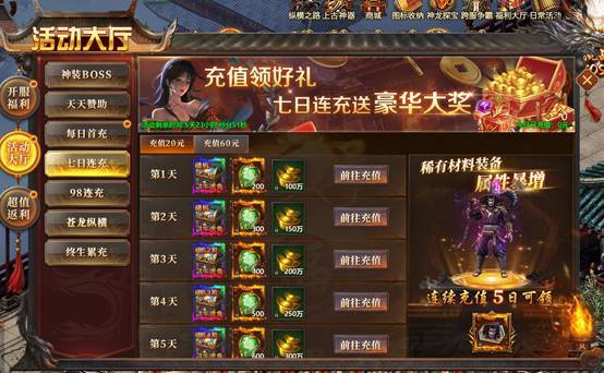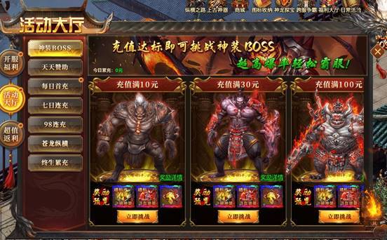 充值达标,即可挑战神装BOSS,可得极品坐骑神装和吸血装备,领取游戏内的真实充值红包即可轻松达标。