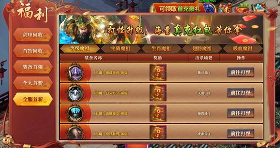 打怪升级,巨额首爆奖励,元宝、钻石秒到账;首斩BOSS可领真实红包。