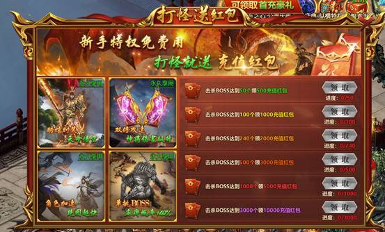 击杀怪物有概率获得真实充值红包,杀的越多送的越多,boss越稀有,掉率越高。