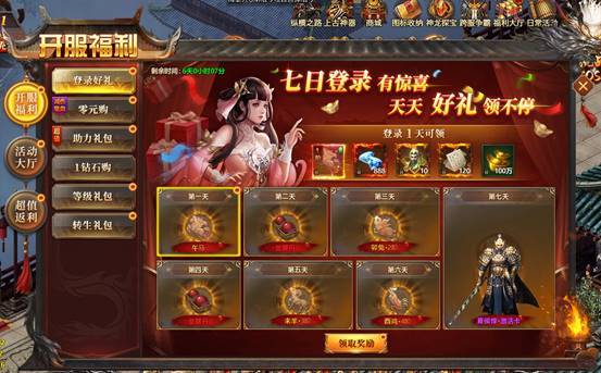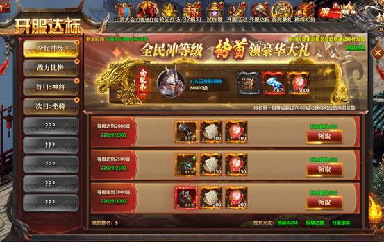 全面冲级、战力比拼、神将、坐骑、翅膀等全方位养成达标,超值奖励领不停。