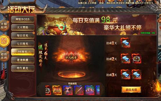 每日充值满98元,可领取大量返利钻石,累计达标可领取绝版称号、时装、坐骑、翅膀等极品奖励。