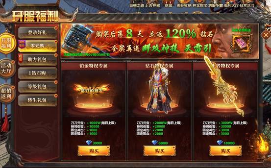 刀刀元宝,神将伤害,固定减伤,固定吸血;购买后第8天立返120%钻石,全买再送群攻神技。